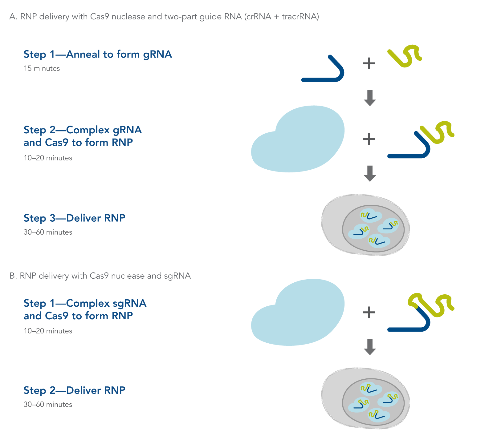 I metodi di genome edting CRISPR-Cas9 utilizzano un’endonucleasi Cas9 per generare rotture a doppio filamento nel DNA. L’endonucleasi Cas9 richiede un RNA CRISPR (crRNA) per specificare la sequenza bersaglio del DNA, e il crRNA deve essere combinato con il crRNA transattivante (tracrRNA) per attivare l’endonucleasi e creare un complesso ribonucleoproteico di editing funzionale (Figura 1A). In un approccio alternativo, il crRNA e il tracrRNA possono essere somministrati come un singolo oligonucleotide RNA (Figura 1B). Dopo la scissione, il DNA viene riparato mediante giunzione non omologa (NHEJ) o ricombinazione diretta dall’omologia (HDR), ottenendo una sequenza modificata. I reagenti e i kit Alt-R CRISPR-Cas9 forniscono gli strumenti essenziali e ottimizzati necessari per utilizzare questo percorso nella ricerca sull’editing genomico.